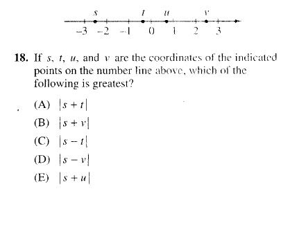 <p>I would place t around -0.25 instead of -0.75 (it’s closer to zero than to -1), for a better approximation. But to be completely honest, you could use s = -2.5, t = -0.5, u = 0.5, and v = 2.5 and still get this right–approximation questions on the SAT generally have a pretty generous margin of error to leave some room for more coarse estimations (although, of course, higher precision is preferable if you have the time to figure things out).</p>