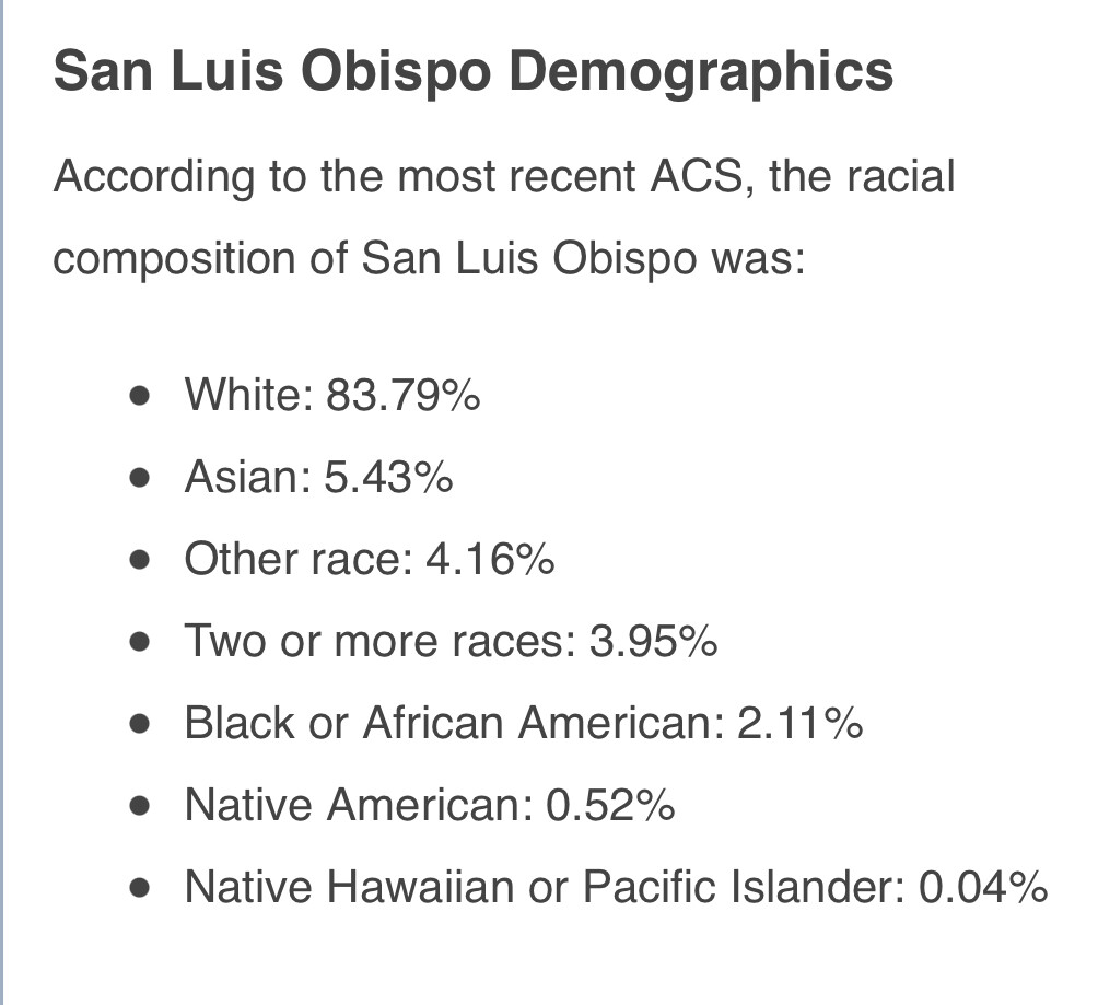 While the percentage of White students at CPSLO is much lower than at some forum favorites like Alabama (77%), it is higher than at other California public universities and probably most California high schools. So while “whitest place on earth” is an obvious exaggeration, it may be relatively so for many students from California.