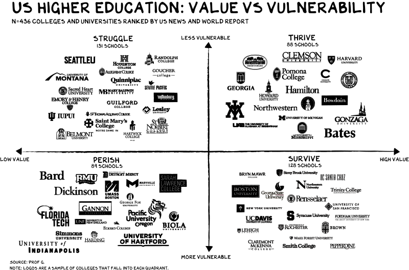 A school with 7,300 students and a $300,000,000 endowment known nationally for basketball and little if nothing else is going to “thrive” and Brown University, a school with 10,000 students and a $7.0 billion endowment and is known globally as an elite academic powerhouse is going to just get by. I’m not trying to bash Gonzaga, but come on here.