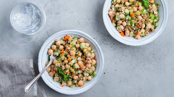 Jennifer Aniston salad of course - just made it today. I use quinoa instead of bulgur. The main ingredients are quinoa, chopped cucumbers and parsley, a can of chickpeas, chopped pistachios, lemon juice and olive oil, and feta.