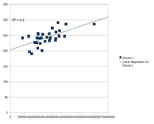 <p>Just an illustration of my point, here’s a plot of the cumulative wins vs. cumulative payroll for each franchise over the past 3 seasons. As you can see, R-squared is .4, so the correlation coefficient is .63 which is nearing a strong correlation. It also shows how huge the gap is between the Yankees and anyone else.</p>