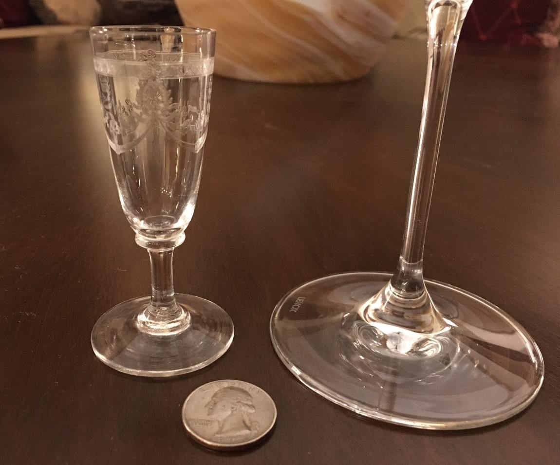 We have a ton of vintage stemware, highballs, cordials, snifters, flutes, etc. @SweetBoy1. We found those funky little martini glasses in a flea market near Salem harbor. My favorite is a set of these tiny etched crystal liqueurs that I found in an antique shop in Marblehead, MA. They hold about two sips of Chambord–a perfect nightcap.