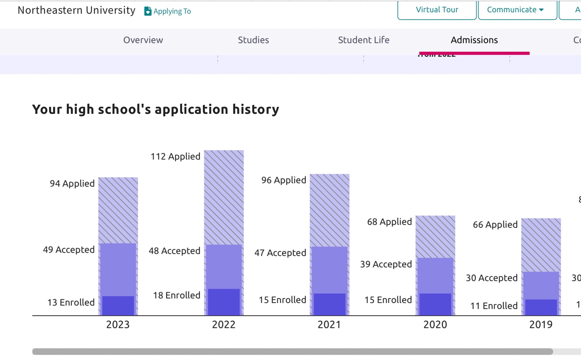 That hasnât been the experience at our HS (strong public HS in MA). I glanced at SCOIR and last year (class of 2023) NEU had an acceptance rate (among our students) of a little over 50%. There wasnât an appreciable difference in acceptance rates between ED, EA and RD. About 88 kids applied and 49 were accepted. I think around 20 are attending.