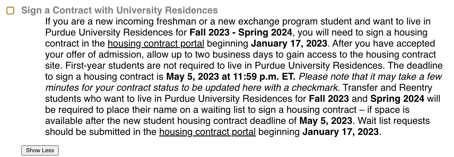 You’re still guaranteed Purdue housing if you apply between April 16 - May 5. It just might not be traditional housing on the campus. It could be in a Purdue-owned or leased building off campus (but not super far away). If you don’t apply by May 5, you’ll have to find your own housing.