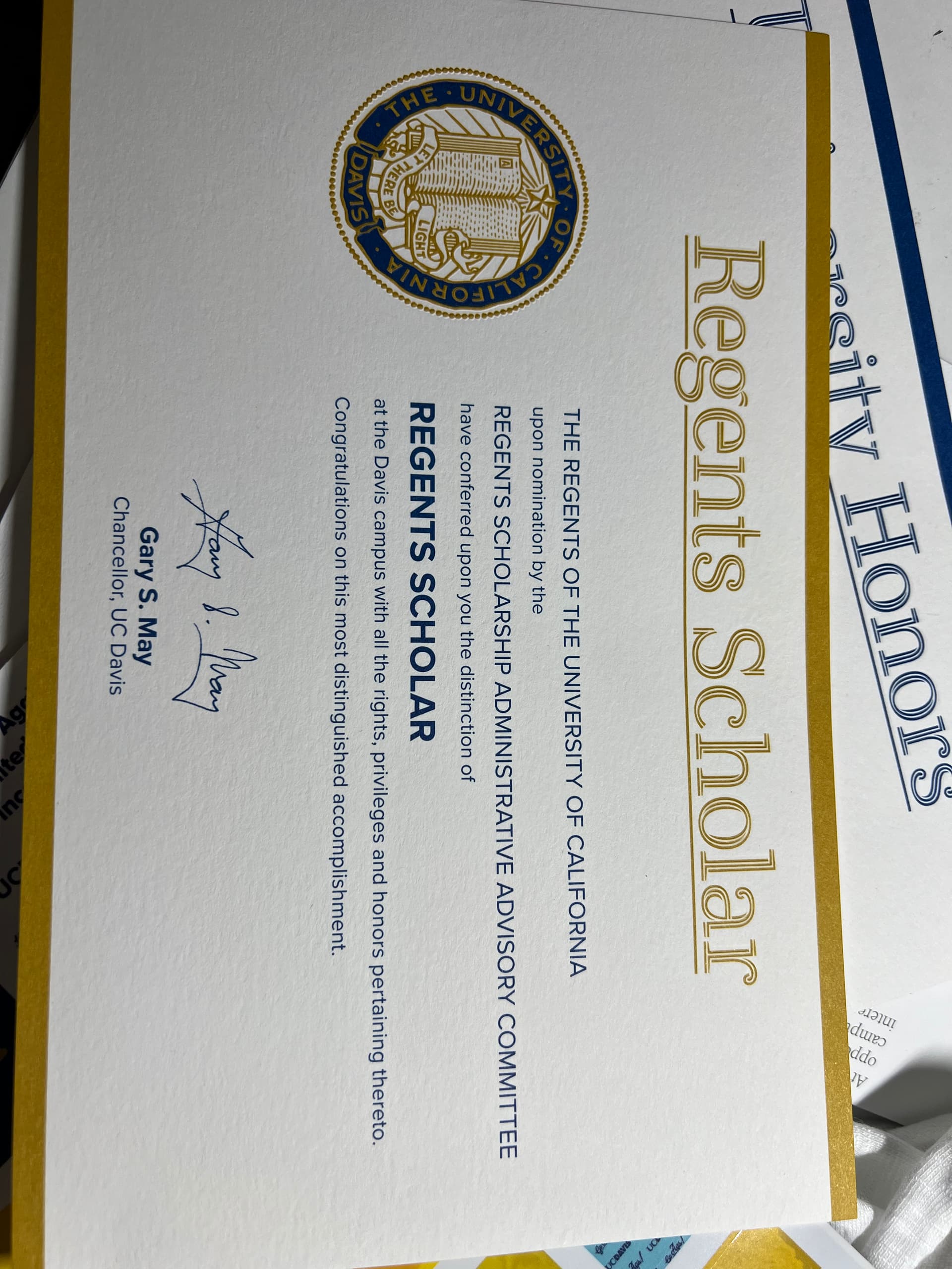 Congratulations it means he has been selected as a Regents scholar, one of the most prestigious merit awards for UC Davis.