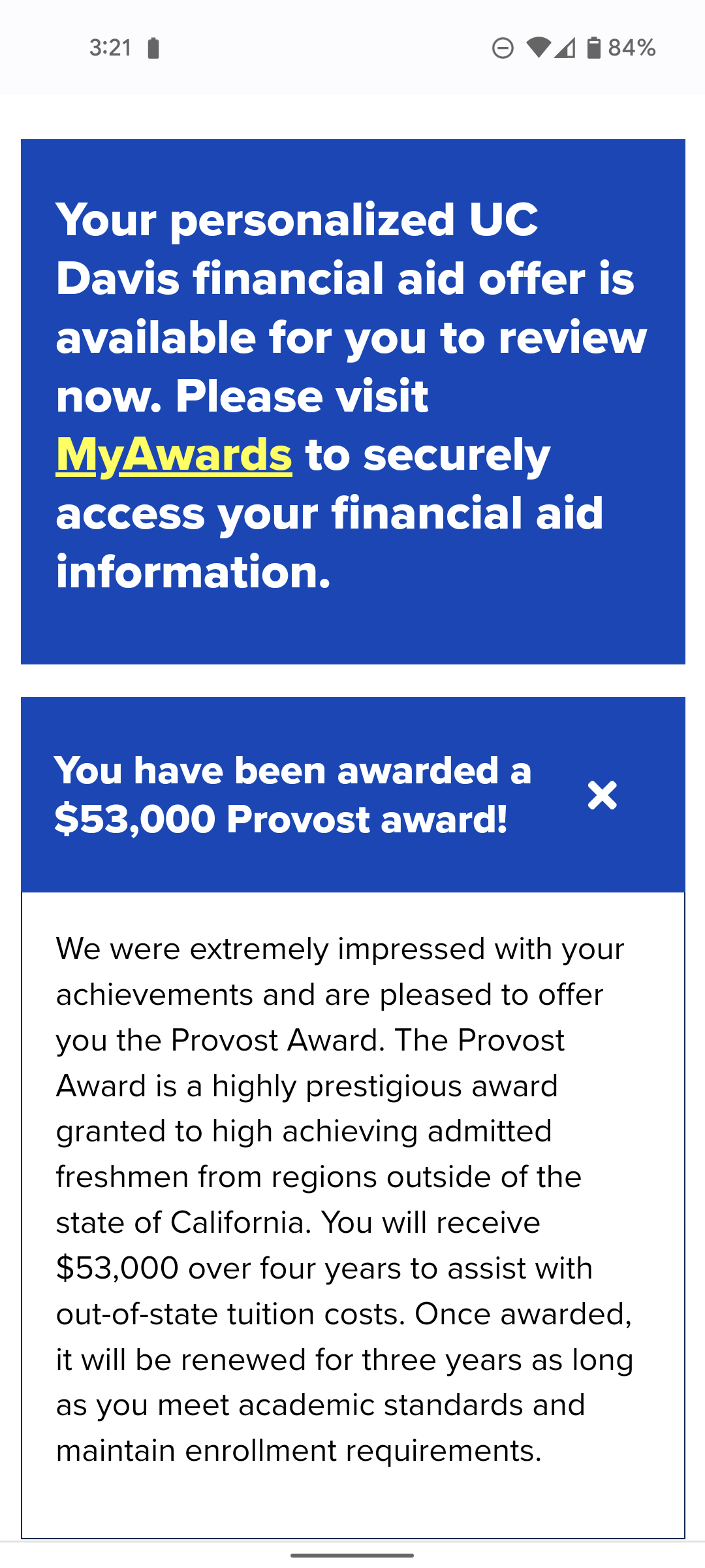 Thank you. It also aligns almost with the $7500 Regents award! But certainly, they’d send a letter of congratulations or something if that is what it was?
